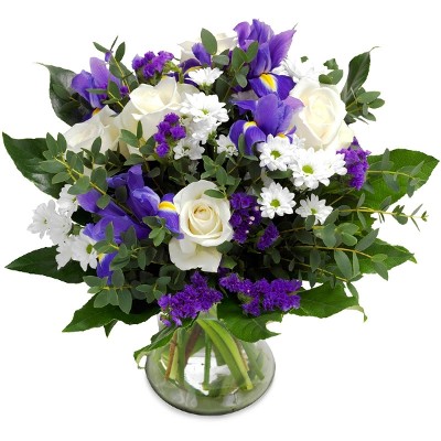 Dieser atemberaubende Strauß besticht durch seine exquisite Mischung aus weißen, tiefblauen und violetten Farbtönen, die Männer und Frauen gleichermaßen ansprechen. Mit seiner heiteren und himmlischen Ausstrahlung, die ein Gefühl von Frieden und Ruhe hervorruft, ist er die perfekte Wahl für jeden Empfänger. Lasse dich von der himmlischen Schönheit dieses Straußes verwöhnen, der eine fesselnde Auswahl an Farben und Texturen zu einem unschlagbaren Preis bietet. Ob als Ausdruck der Bewunderung, der Sympathie oder einfach, um jemandem den Tag zu verschönern - dieses vielseitige Arrangement verspricht einen Hauch von erschwinglicher Eleganz und Komfort, ohne dabei Kompromisse bei der Qualität einzugehen.
